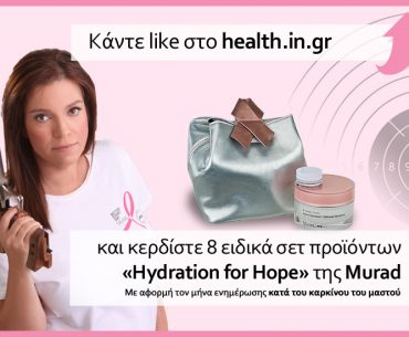 Για πρώτη φορά στην Ελλάδα, η εταιρεία καλλυντικών Murad στηρίζει τον Μήνα Ενημέρωσης για τον Καρκίνο του Μαστού και μέσω του health.in.gr σας δίνει την δυνατότητα να κερδίσετε 8 ειδικά σετ προϊόντων «Hydration for Hope», αξίας 49 ευρώ έκαστη.