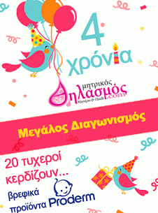 Το mitrikosthilasmos.com έγινε 4ων ετών και γιορτάζει τα γενέθλιά του με έναν νέο, μεγάλο διαγωνισμό, χαρίζοντας σε 20 τυχερούς επισκέπτες του, υπέροχα σετάκια πρώτης περιποίησης του μωρού από την Proderm, συνολικής αξίας 334 ευρώ!