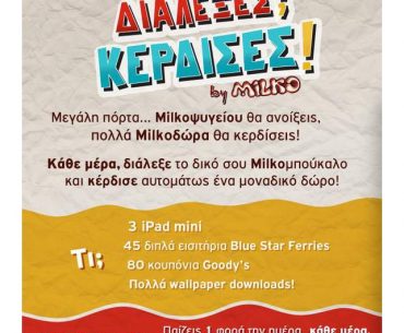 Το Milko διοργανώνει διαγωνισμό και σας δίνει τη δυνατότητα να κερδίσετε 3 mini iPad Wifi, 16GB χρώματος λευκού, 45 εισιτήρια 2 ατόμων της Blue Star Ferries για νησιά του Αιγαίου με επιστροφή, 80 κουπόνια των 5€ εστίασης στα καταστήματα GoodyΆs και wallpapers, που μπορείτε να κατεβάσετε στον υπολογιστή σας.