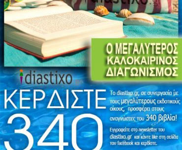 Το diastixo.gr, σε συνεργασία με τις εκδόσεις: Ψυχογιός, Πατάκης, Λιβάνης, Gutenberg, Κέδρος, Διόπτρα, Αφοί Κυριακίδη, Ιωλκός, Καλέντης, Επίκεντρο, Κλειδάριθμος, Ίκαρος, Γκοβόστης, Κριτική, Κίχλη, Γνώση, Γράμματα, Gema, Η Άγνωστη Καντάθ, προσφέρει στους αναγνώστες του 340 βιβλία!