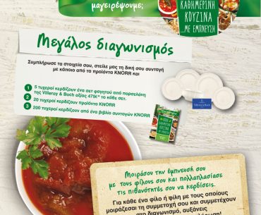 Η σελίδα Knorr Greece διοργανώνει διαγωνισμό και σας δίνει τη δυνατότητα να κερδίσετε 5 σετ από πορσελάνη της Villeroy & Boch αξίας 475€ το σετ, 20 προϊόντα Knorr και 200 βιβλία συνταγών Κnorr.
