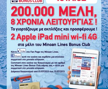 H Minoan Lines S.A. διοργανώνει διαγωνισμό για όλα τα μέλη της Bonus Club για το μήνα Ιούλιο και δίνει τη δυνατότητα σε 2 τυχερούς να κερδίσουν από ένα ipad mini.