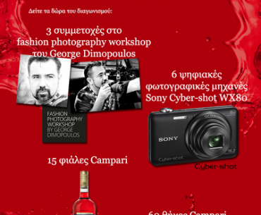 Το Campari διοργανώνει διαγωνισμό και σας δίνει τη δυνατότητα να κερδίσετε 3 Fashion Photography Workshops με τον George Dimopoulos, 6 ψηφιακές φωτογραφικές μηχανές Sony Cyber-shot WX80, 15 φιάλες Campari και 60 θήκες iPhone.