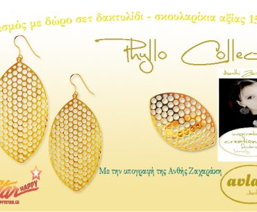 Τα χειροποίητα κοσμήματα Αυλαία και το HappyStar σας κάνουν δώρο 1 σετ σκουλαρίκια και δαχτυλίδι από τη σειρά Phyllo Collection, συνολικής αξίας 156 ευρώ με την υπογραφή της Ανθής Ζαχαράκη.