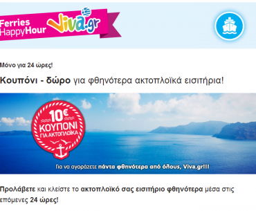 Προλάβετε και κλείστε το ακτοπλοϊκό σας εισιτήριο από το Viva.gr μέσα στις επόμενες 24 ώρες και κερδίστε ένα κουπόνι 10 Ευρώ!