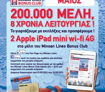 H Minoan Lines S.A. διοργανώνει διαγωνισμό για όλα τα μέλη της Bonus Club για το μήνα Μάη και δίνει τη δυνατότητα σε 2 τυχερούς να κερδίσουν από ένα ipad mini.