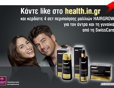 Tο health.in.gr σας προσκαλεί στο προφίλ του στο Facebook και σας δίνει τη δυνατότητα να κερδίσετε 4 σετ περιποίησης μαλλιών HAIRGROW, για τον άνδρα και τη γυναίκα, προσφορά της εταιρείας SwissCare, συνολικής αξίας 300 ευρώ.
