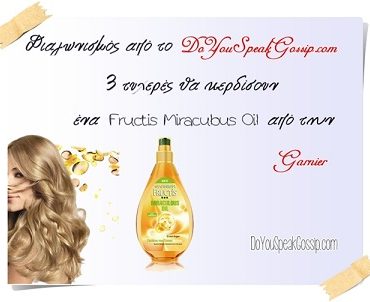 Το DoYouSpeakGossip.com, διοργανώνει διαγωνισμό σε συνεργασία με την Garnier. 3 τυχερές θα έχουν την ευκαιρία να κερδίσουν από ένα Fructis Miraculous Oil για τα μαλλιά τους.