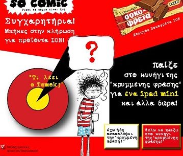 Η σελίδα ION Sokofreta διοργανώνει διαγωνισμό και δίνει τη δυνατότητα σε σε 1 τυχερό να κερδίσει προϊόντα ΙΟΝ, Comics και το νέο mini iPad, σε 3 τυχερούς να κερδίσουν προϊόντα ΙΟΝ & Comics & Lomo φωτογραφικές μηχανές και σε 11 τυχερούς να κερδίσουν προϊόντα ΙΟΝ & Comics.
