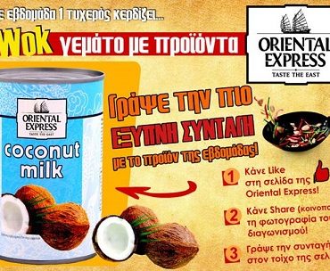 Με ένα νέο, πρωτότυπο, διαδραστικό διαγωνισμό, η Oriental Express καλεί όλους τους λάτρεις της μαγειρικής, να δοκιμάσουν, να πειραματιστούν και να προτείνουν, συνταγές και φρέσκιες ιδέες χρήσης για τα προϊόντα της! Κάθε εβδομάδα θα πρωταγωνιστεί ένα μοναδικό προϊόν Oriental Express το οποίο θα προσκαλεί «Έξυπνες» προτάσεις και ιδέες χρήσεις του. Η πιο δημιουργική ιδέα της εβδομάδας θα κερδίζει λαχταριστά προϊόντα Oriental Express «σερβιρισμένα» σε ένα Γουόκ!