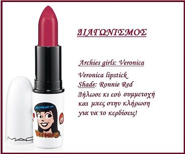 To fairiesofbeauty.blogspot.gr σας χαρίζει ένα υπέροχο κραγιόν MAC από τη νέα συλλογή της, Archie’s Girls. Η απόχρωση του είναι η Ronnie Red.
