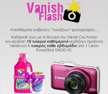 Η σελίδα Vanish διοργανώνει διαγωνισμό και δίνει τη δυνατότητα σε 10 τυχερούς κάθε ημέρα να κερδίσουν από 1 Vanish Power White Σκόνη 500gr και 1 Vanish Extra Hygiene Gel 940mL και σε 1 τυχερό κάθε εβδομάδα να κερδίσει 1 φωτογραφική μηχανή Canon PowerShot SX230 HS.