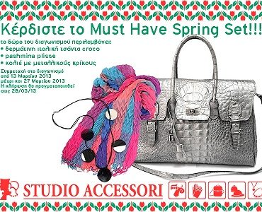 Η σελίδα Studio Accessori διοργανώνει διαγωνισμό και σας δίνει τη δυνατότητα να κερδίσετε ένα «Must Have Spring Set» (περιλαμβάνει μία δερμάτινη ιταλική τσάντα croco, μία pashmina plisse, ένα κολιέ με μεταλλικούς κρίκους), συνολικής αξίας 200,00 €.