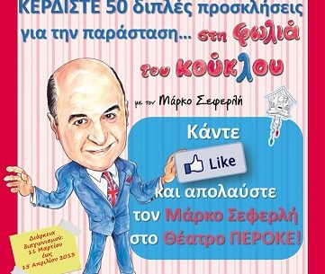 Η σελίδα Markos Seferlis διοργανώνει διαγωνισμό και σας δίνει τη δυνατότητα να κερδίσετε 50 διπλές προσκλήσεις για την παράσταση του Μάρκου Σεφερλή στο θέατρο Περοκέ: στη φωλιά του κούκΛου!