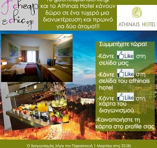 Το gocheapandchic.gr διοργανώνει διαγωνισμό και σας δίνει τη δυνατότητα να κερδίσετε μια διανυκτέρευση για δύο άτομα, μαζί με πρωινό στο ξενοδοχείο Athinais hotel.