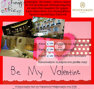 To gocheapandchic.gr και το ξενοδοχείο Πεντελικόν σας κάνουν δώρο μία διανυκτέρευση στο ξενοδοχείο Πεντελικον, την ημέρα του Αγ. Βαλεντίνου, μαζί με πρωινό και χρήση γυμναστηρίου.
