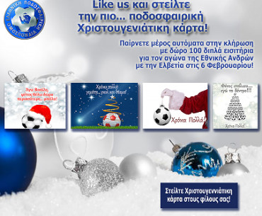 Η ΕΠΟ διοργανώνει διαγωνισμό και σας καλεί να στείλετε την πιο… ποδοσφαιρική Χριστουγεννιάτικη κάρτα και να πάρετε μέρος αυτόματα στην κλήρωση με δώρο 100 διπλά εισιτήρια για τον αγώνα της Εθνικής Ανδρών με την Ελβετία στις 6/2.