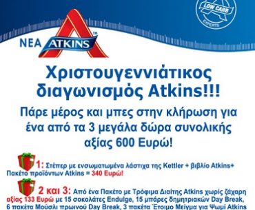 Η σελίδα Atkins Greece διοργανώνει διαγωνισμό και σας δίνει τη δυνατότητα να κερδίσετε 1 Στέπερ της Kettler με ενσωματωμένα λάστιχα, 1 βιβλίο Atkins κι ένα Πακέτο Προϊόντων Atkins συνολικής αξίας 340 Ευρώ (1ος νικητής) και 2 πακέτα με τρόφιμα διαίτης Atkins χωρίς ζάχαρη αξίας 133 Ευρώ με 15 σοκολάτες Endulge, 15 μπάρες δημητριακών Day Break, 6 πακέτα Μούσλι πρωινού Day Break, 3 πακέτα Έτοιμο Μείγμα για Ψωμί Day Break και 6 πρωτεϊνούχα ροφήματα Advantage (2ος και 3ος νικητής).