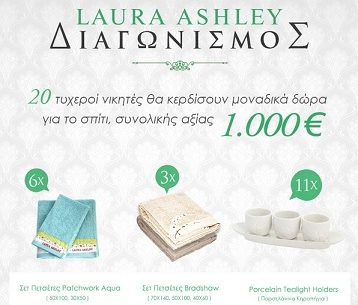 Η Laura Ashley Greece διοργανώνει διαγωνισμό και σας δίνει τη δυνατότητα να κερδίσετε 3 σετ πετσέτες Bradsaw (70×140, 50×100, 40×60), 6 σετ πετσέτες Patchwork Aqua (50×100, 30×50) και 11 σετ Porcelain Tealight Holders.