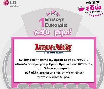 Η LG Hellas διοργανώνει διαγωνισμό και σας δίνει τη δυνατότητα να κερδίσετε κάθε μέρα, διπλά εισιτήρια για την Πρεμιέρα της ταινίας «Αστερίξ και Οβελίξ στη Βρετανία», η οποία θα πραγματοποιηθεί την Τετάρτη 17 Οκτωβρίου του 2012, στον κινηματογράφο ODEON KOSMOPOLIS, αίθουσα 5 ή διπλά εισιτήριο για την Πρώτη επίσημη προβολή της ταινίας, η οποία θα πραγματοποιηθεί την Πέμπτη 18 Οκτωβρίου του 2012, στον κινηματογράφο ODEON KOSMOPOLIS. Οι νικητές που κατοικούν εκτός Αθηνών κερδίζουν διπλά εισιτήρια τα οποία και θα μπορέσουν να εξαργυρώσουν σε όλους τους κινηματογράφους της Odeon από την έναρξη της ταινίας στον κινηματογράφο της περιοχής τους.
