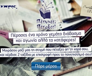 Η Olympic Air διοργανώνει το διαγωνισμό «Πέτυχες; Πέταξες!» και δίνει τη δυνατότητα σε 10 τυχερούς να κερδίσουν από 2 αεροπορικά εισιτήρια (συμπεριλαμβανομένων των φόρων αεροδρομίου) με την Olympic Air προς επιλεγμένο προορισμό, μετ’ επιστροφής.
