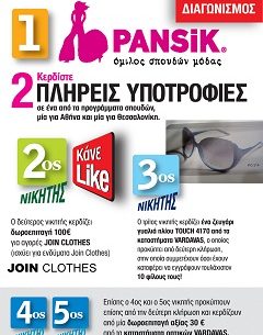 Η PANSIK διοργανώνει διαγωνισμό και σας δίνει τη δυνατότητα στους 2 πρώτους νικητές να κερδίσουν από 1 ΠΛΗΡΗ ΥΠΟΤΡΟΦΙΑ σε ένα από τα προγράμματα σπουδών μία στην Αθήνα και μία στην Θεσσαλονίκη. Ο 2ος νικητής κερδίζει μια δωροεπιταγή 100€ για αγορές JOIN CLOTHES. Ακόμα, ο 3ος νικητής, ο οποίος προκύπτει από την δεύτερη κλήρωση στην οποία συμμετέχουν όσοι έχουν καταφέρει να εγγράψουν τουλάχιστον 10 φίλους τους, κερδίζει ένα ζευγάρι γυαλιά ηλίου TOUCH 4170 από τα καταστήματα VARDAVAS. Επίσης ο 4ος και 5ος νικητής προκύπτουν επίσης από την δεύτερη κλήρωση και κερδίζουν από μία δωροεπιταγή 30 € από τα καταστήματα οπτικών VARDAVAS.