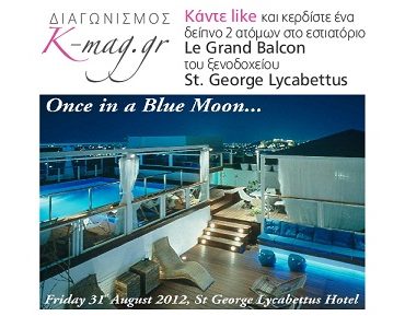 Το online μαγκαζίνο The K-magazine και το ξενοδοχείο St. George Lycabettus διοργανώνει διαγωνισμό και σας δίνει τη δυνατότητα να κερδίσετε ένα γκουρμέ δείπνο 5 πιάτων (με κρασί) , για 2 άτομα στο εστιατόριο Le Grand Balcon για την Παρασκευή 31 Αυγούστου, με αφορμή την μπλε πανσέληνο.
