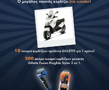 Η σελίδα Gillette διοργανώνει διαγωνισμό και δίνει τη δυνατότητα σε ένα τυχερό να κερδίσει ένα Scooter Piaggeo X7 EVO 125 και σε 10 ακόμα προϊόντα ξυρίσματος και περιποίησης της επιδερμίδας Gillette για ένα χρόνο.
