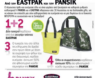 Η σελίδα PANSIK scuola di moda διοργανώνει διαγωνισμό και σας δίνει τη δυνατότητα να κερδίσετε 2 ζευγάρια τσάντες EASTPAK.