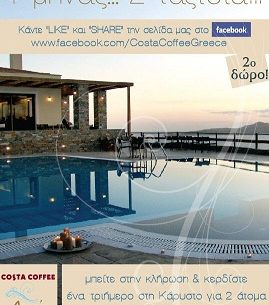 Τα COSTA COFFEE σας κάνουν δώρο ένα τριήμερο (δύο διαμονές) για 2 άτομα με πρωινό στο ΑΙΓΑΙΑ Hotel στην Κάρυστο Ευβοίας.
