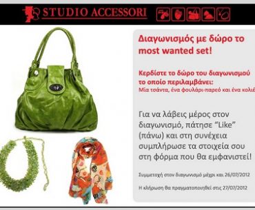 Το Studio Accessori διοργανώνει διαγωνισμό και σας δίνει τη δυνατότητα να κερδίσετε το most wanted set (περιλαμβάνει μία τσάντα, ένα φουλάρι-παρεό και ένα κολιέ), συνολικής αξίας 58,00 €.