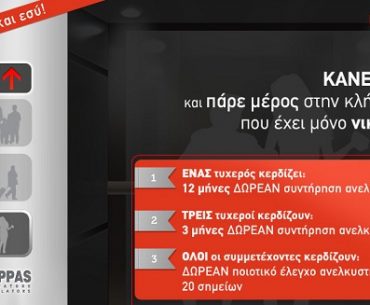 Η εταιρεία PAPPAS διοργανώνει μεγάλο φιαγωνισμό για ΔΩΡΕΑΝ συντήρηση ανελκυστήρα. 1 μεγάλος τυχερός κερδίζει 12 μήνες ΔΩΡΕΑΝ συντήρηση στον ανελκυστήρα του, 3 τυχεροί κερδίζουν από 3 μήνες ΔΩΡΕΑΝ συντήρηση στον ανελκυστήρα τους και ΟΛΟΙ οι διαγωνιζόμενοι κερδίζουν ΔΩΡΕΑΝ ποιοτικό έλεγχο στον ανελκυστήρα τους.