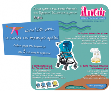 Τα Βρεφικά Πολυκαταστήματα ΛΗΤΩ διοργανώνουν διαγωνισμό και σας δίνουν τη δυνατότητα να κερδίσετε ένα καρότσι Avio stroller all over, ένα διπλό ηλεκτρικό θήλαστρο mini electric plus και 1 εκπαιδευτικό ρολόι Gro Clock Mr Star & Sun.