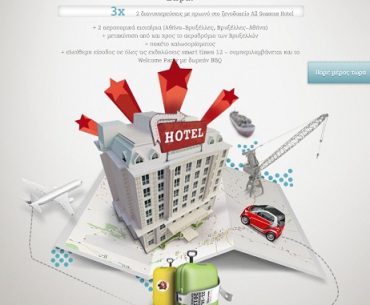Το smart.greece διοργανώνει διαγωνισμό και δίνει τη δυνατότητα σε 3 μεγάλους τυχερούς να κερδίσουν από 2 διανυκτερεύσεις στο ξενοδοχείο All Seasons Hotel, 2 αεροπορικά εισιτήρια (Αθήνα-Βρυξέλλες, Βρυξέλλες-Αθήνα), μετακίνηση από και προς το αεροδρόμιο των Βρυξελλών, πακέτο καλωσορίσματος και ελεύθερη είσοδος σε όλες τις εκδηλώσεις smart times 12, στο οποίο συμπεριλαμβάνεται και το Welcome Party με δωρεάν BBQ.