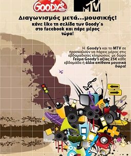 Η Goody’s και το MTV σας προσκαλούν να πάρετε μέρος στις εβδομαδιαίες κληρώσεις με δώρο γεύμα Goody’s αξίας 25 Ευρώ κάθε εβδομάδα ή άλλα απίθανα μουσικά δώρα.