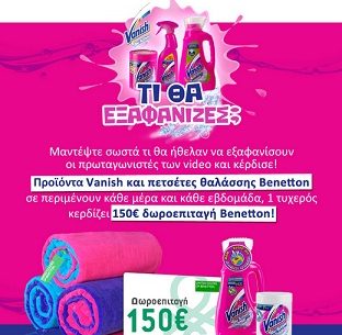 Η σελίδα Vanish Greece διοργανώνει διαγωνισμό και σας καλεί να απαντήσετε στο video που θα δείτε. Οι πρώτοι 10 πιο γρήγοροι παίκτες µε σωστή απάντηση κερδίζουν αυτόµατα από 1 Vanish Oxi Action Power White 500gr και 1 Vanish Gel 1L. ο καθένας. Όλοι οι παίκτες µε σωστές απαντήσεις µπαίνουν στην κλήρωση για το δώρο της ηµέρας το οποίο είναι 1 πετσέτα θαλάσσης Benetton και στην κλήρωση της εβδοµάδας για µια δωροεπιταγή των 150 ευρώ για αγορές σε καταστήµατα Benetton.