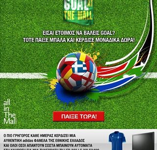 Η σελίδα The Mall Athens διοργανώνει διαγωνισμό στον οποίο κάθε μέρα ο γύρος του παιχνιδιού θα θέτει και από μία καινούργια ερώτηση. Ο πιο γρήγορος χρήστης που θα απαντήσει σωστά στην ερώτηση του γύρου, μόλις αυτός καθίσταται διαθέσιμος, θα κερδίζει αυτόματα μια φανέλα της Εθνικής Ελλάδος Adidas. Όλοι οι χρήστες με σωστές απαντήσεις θα κερδίζουν από μια συμμετοχή στην τελική κλήρωση για μια TV LED 32′ LG 32LS3400.