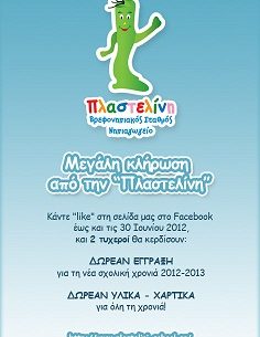 Ο Πρότυπος Βρεφονηπιακός Σταθμός “Πλαστελίνη” διοργανώνει διαγωνισμό και σας δίνει τη δυνατότητα να κερδίσετε δωρεάν εγγραφή για τη νέα σχολική χρονιά 2012-2013 αλλά και δωρεάν υλικά – χαρτικά για όλη τη χρονιά για 2 τυχερούς.