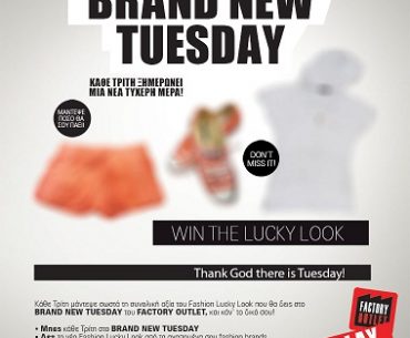 Κάθε Τρίτη είναι η τυχερή σας μέρα! Μπείτε στη σελίδα του Factory Outlet στο facebook και παίξτε Βrand New Tuesday. Μαντέψτε σωστά τη συνολική αξία του Fashion Lucky Look που θα δείτε στο Βrand New Tuesday του Factory Outlet και κάντε το δικό σας.