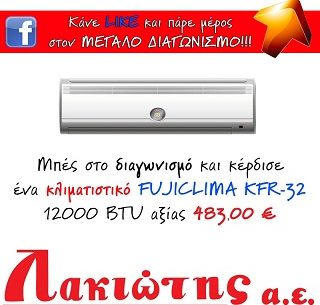 Η εταιρεία ΛΑΚΙΩΤΗΣ Α.Ε. διοργανώνει διαγωνισμό και σας δίνει τη δυνατότητα να κερδίσετε ένα κλιματιστικό FUJICLIMA KFR-32 12000 BTU αξίας 483,00€.