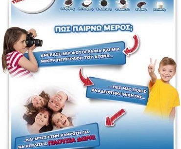 Τα μπισκότα Oreo διοργανώνουν διαγωνισμό και σας δίνουν τη δυνατότητα να κερδίσετε 5 πακέτα δωρεάν οικογενειακών διακοπών στην Ελλάδα (επιλογή από Σαντορίνη, Χανιά, Πάρος, Ρόδος, Νάξος, Λευκάδα, Κέρκυρα, Χαλκιδική), 5 εβδομαδιαία προγράμματα στην αθλητική παιδική κατασκήνωση Sport Camp στο Λουτράκι για παιδιά 6-14 ετών, 30 Sony PSP και μαζί το παιχνίδι CARS και 100 διπλά εισιτήρια για τα ODEON Cinemas.