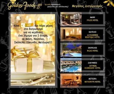 Το GoldenFoods.gr διοργανώνει διαγωνισμό και σας δίνει τη δυνατότητα να κερδίσετε 5 ταξίδια σε Μάνη, Ναύπλιο, Σκόπελο, Ζάκυνθο και Μετέωρα.