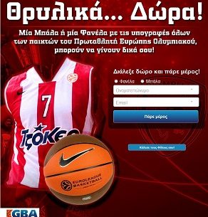 Η σελίδα GBAcademy διοργανώνει διαγωνισμό και σας δίνει τη δυνατότητα να κερδίσετε μία συλλεκτική μπάλα και μια φανέλα με τις υπογραφές όλων των παικτών του Πρωταθλητή Ευρώπης Ολυμπιακού.