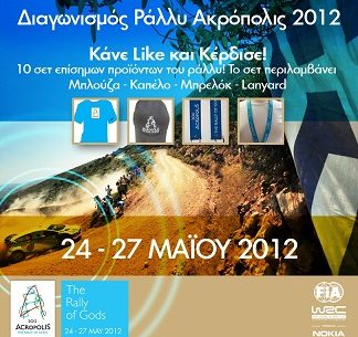 Η σελίδα Acropolis Rally of Greece διοργανώνει διαγωνισμό και σας δίνει τη δυνατότητα να κερδίσετε 10 σετ επίσημων προϊόντων του ράλλυ. Το σετ περιλαμβάνει Μπλούζα-Καπέλο-Μπρελόκ-Lanyard.