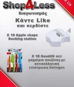 Το Shop4less διοργανώνει διαγωνισμό και σας δίνει τη δυνατότητα να κερδίσετε 10 Apple shape Docking station και 10 Good4U σετ μαχαίρια κουζίνας με αντικολλητική επίστρωση Solingen.