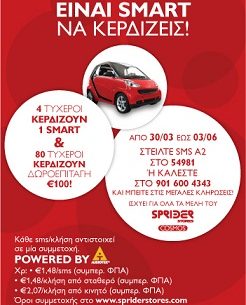 Τα Sprider Stores χαρίζουν 4 SMART στα μέλη του Sprider Stores Cosmos. 4 τυχεροί κερδίζουν από 1 αυτοκίνητο SMART & 80 ακόμα τυχεροί κερδίζουν από 1 δωροεπιταγή 100€.