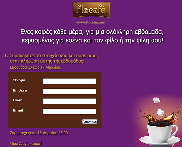 Τα Flocafé διοργανώνουν διαγωνισμό και δίνουν τη δυνατότητα σε ένα τυχερό να κερδίσει 2 καφέδες ανά ημέρα και για 7 ημέρες συνολικά, για τον ίδιο και ακόμα ένα άτομο της επιλογής του, σε ένα κατάστημα Flocafé που θα δηλώσει εκ των προτέρων.