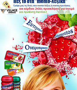 Η σελίδα Mentos σας προσκαλεί να γράψετε κάτι στα mentoλέζικα (μια λέξη ή πρόταση δικής σας έμπνευσης που να περιέχει το συνθετικό mentos) στα comments του tab διαγωνισμού «mentoλέζικα» και 3 νικητές, μετά από κλήρωση, θα κερδίσουν προιόντα mentos & διπλά εισιτήρια για Village Cinemas.