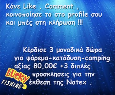 Η σελίδα Lucky-Fishing διοργανώνει διαγωνισμό και δίνει τη δυνατότητα στον πρώτο τυχερό να κερδίσει ένα μηχανάκι Shimatsu Atlas 5000, στο δεύτερο τυχερό μια μάσκα και ένα αναπνευστήρα Glaros sub, στον τρίτο έναν υπνόσακο Τerra Sleeping bag και σε 3 ακόμα τυχερούς από 2 προσκλήσεις για την έκθεση της Natex, για δωρεάν είσοδο.