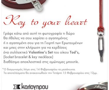 Η σελίδα Καλογήρου διοργανώνει το διαγωνισμό “Key to your heart” και σας δίνει τη δυνατότητα να κερδίσετε ένα Valentine’s Set του οίκου Tod’s.